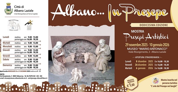 NON SOLO CICLISMO Torna “Albano…in presepe” – La magia continua nella XII edizione della mostra dei presepi artistici Novembre 8, 2025 Albano Laziale si prepara ancora una volta ad accogliere la magia del Natale con la dodicesima edizione di “Albano…in presepe”, l’attesissima mostra dei presepi artistici che, da oltre un decennio, accompagna e illumina le festività della città. L’iniziativa, ideata dal Comune di Albano Laziale è realizzata in collaborazione con l’Associazione Amici del Presepe Albano Laziale e con il Museo Civico “Mario Antonacci”. L’inaugurazione L’apertura ufficiale si terrà sabato 29 novembre 2025 alle ore 11.00 presso la Sala Conferenze del Museo Civico “Mario Antonacci”, all’interno della splendida Villa Ferrajoli (via Risorgimento 3 – Albano Laziale). Con questo momento solenne prenderà il via una nuova edizione ricca di emozioni, creatività e spirito natalizio. Date e orari di apertura La mostra resterà aperta dal 29 novembre 2025 all’10 gennaio 2026, offrendo ai visitatori oltre 40 giorni per vivere un viaggio suggestivo tra arte, tradizione e fede. Sarà possibile visitare l’esposizione tutti i giorni dalle ore 9.00 alle 13.00, con aperture pomeridiane nei giorni di lunedì, giovedì, sabato e domenica dalle 16.00 alle 18.30. Aperture straordinarie: