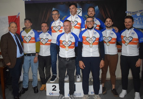 Pioggia di podi per la Maximo-Bikelab team Astolfi Vittorie non solo nel Lazio ma anche fuori regione L'atleta di Velletri classe '85 Luigi Serangeli alla Granfonfo degli Squali , ottiene una delle sue piu' belle vittorie , aggiudicandosi la maglia di Campione Italiano Vigili del Fuoco 2024. La manifestazione si e' svolta con partenza da Cattolica (Emilia-Romagna ) e con arrivo a Gabbicce Monte. La 9 edizione della G:F: Squali Trek , che con il motto " Bandita la noia " su un percorso impegnativo ma vivace e divertente , quest'anno assegnava le prestigiose maglie di Campione Italiano FFF. Sui variegati 128 km. del lungo con oltre 2.020 mt di dislivello , con la ostica salita del Monte AltavelioOsteriaccia con la pendenza massima del 14% , con l'ottimo tempo di 03:37:18 Luigi Serangeli saliva sul primo gradino del podio cat. M2 a seguire Manuel Crescini 03:40:49 e Luca Gustini 03:44:42. Mentre alcuni giorni prima il romano classe 1985 Bruno Patruno si aggiudicava il trofeo Ciampino Bike , gara in circuito localita' Mazzocchio Pontinia , presentandosi solitario a braccia alzate sul traguardo , seguivano in fascia gialla Giulio De Luca ( F.lli Dell'Aguzzo ) e Alfredo Di Sano ( Emme 2 Erre ) . Grossi festeggiamenti da parte di tutto il team per la sua prima vittoria del 2024. Sono seguiti anche podi di prestigio a Terracina per il trofeo il Gatto & la Volpe , per Marco Gabrieli che saliva sul primo gradino del podio nella cat. gialli seguito da Elio Gargiulo e Gennaro De Cicco.