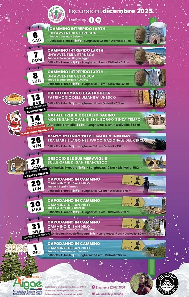 NON SOLO CICLISMO ............ ESCURSIONI DICEMBRE 2025 Camminatori e Camminatrici ecco a voi il programma di Dicembre 2025. Un mese ricco di eventi e di escursioni insieme nella natura!! Un mese di camminate, da condividere e vivere insieme Emanuela 3290724800 |